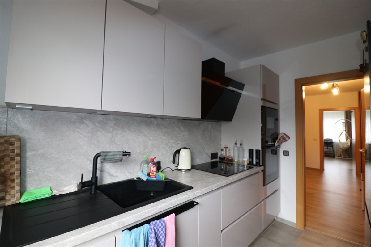 Die Küche bietet ausreichend Platz für eine zweizeilige Kücheneinrichtung. Das Fenster sorgt für genügend Licht und für gute Belüftungs-Möglichkeiten. Der Boden ist mit PVC ausgelegt.