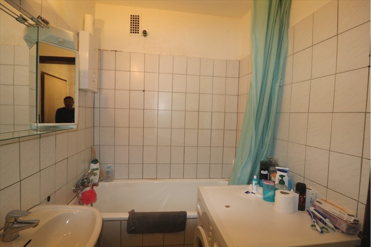 Badezimmer: Das innenliegende Bad ist mit weißen Wandfliesen gestaltet. Es verfügt über eine Wanne, ein Waschbecken und ein WC. Die Waschmaschine findet hier Ihre Platz und Anschlüsse.
